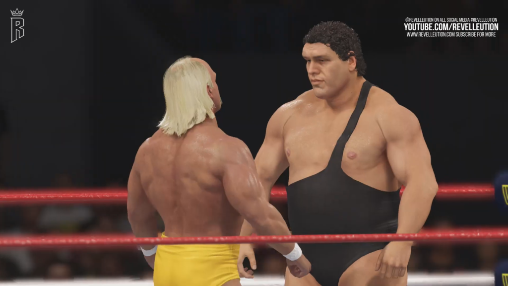 We then then jump back in time all the way to WrestleMania 3 and the iconic stare down between Hulk Hogan and Andre the Giant, with Hogan in game delivering a leg drop to a downed Andre.