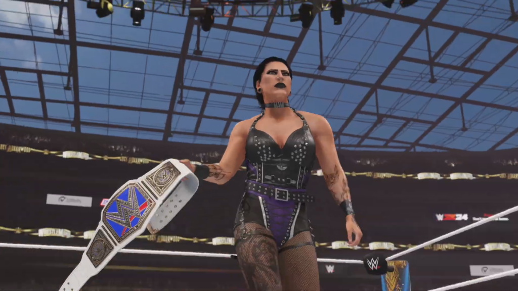 We then get a look a look at another WrestleMania 39 match in the form of the Rhea Ripley and Charlotte Flair SmackDown Women’s Championship match, which is also likely a part of the showcase of the immortals showcase. Mami delivers a stomp to Charlotte Flair who unfortunately is just out of shot before celebrating the win with what looks to be a brand new Championship Victory scene or a showcase cutscene. I hope to god Charlotte has that iconic black puffer coat because not only would her model look amazing in it, I also want it as part of the creation suite.