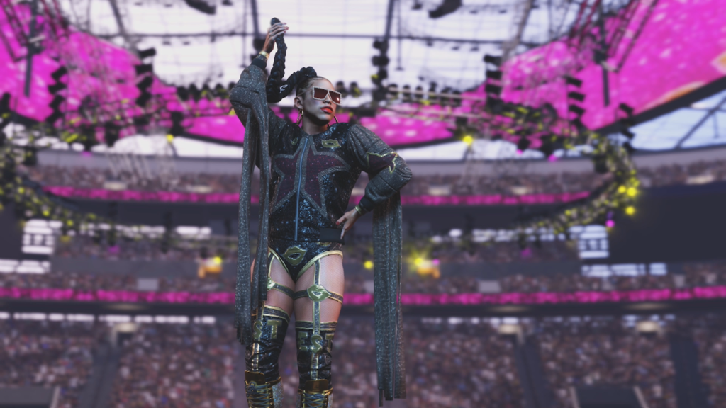 At the start of the video we mentioned just how incredible the arena’s look in this year’s game and I just want to double down once again as we see Bianca celebrate her win within the WrestleMania Hollywood arena. The celebration gives off a better look at Bianca’s attire as she celebrates under the glass ceiling. Now if that isn’t poetic I don’t know what is!