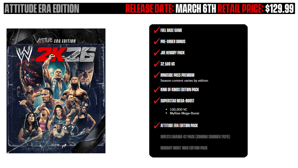 Those who pre-order the Attitude Era edition on PlayStation or Xbox before February 23rd will also receive 15,000 Vc in WWE 2K26 as well as 67,500 VC in WWE 2K25.Those who pre-order any edition of  WWE 2K26 will also receive the digital base game of WWE 2K25 at no additional cost.
