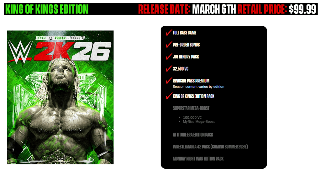 Next Up we have the King of Kings Deluxe edition of WWE 2K26 which comes in at $99.99. Those who purchase the Deluxe edition of WWE 2K26 will have the opportunity to play the game one week earlier on March 6th. The Deluxe edition comes with the Joe Hendry pack as well as Ringside Pass Premium Season 1, 32,500 VC, and the King of Kings Pack.