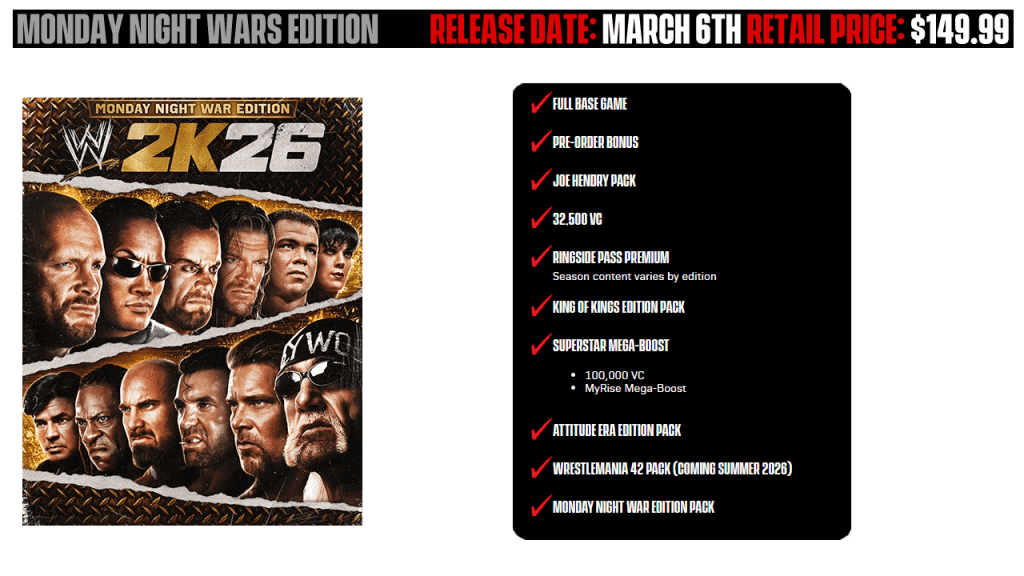 Those who want the ultimate WWE 2K26 experience can purchase the Monday Night War edition which comes in at $149.99.