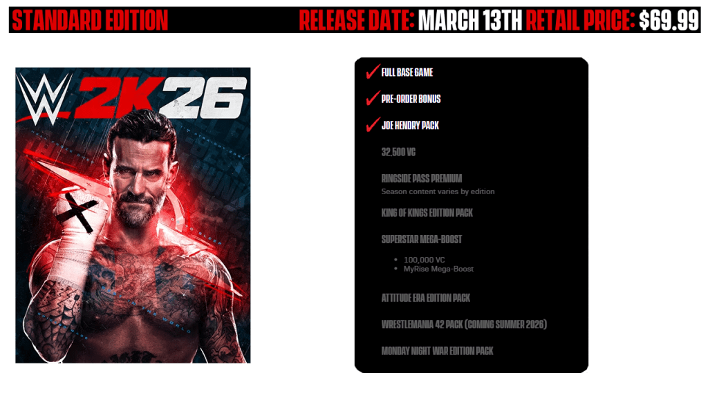 Starting off with the Standard edition of WWE 2K26, this version will cost players $69.99 and will be available to play from March 13th 2026.